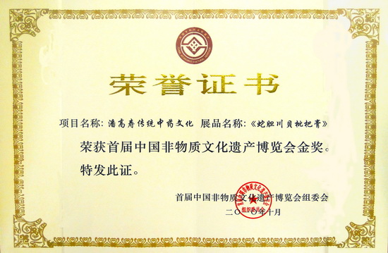 1216日,在廣州市非物質文化遺產工作會議上,我司名牌產品“蛇膽川貝枇杷膏”獲頒“首屆中國非物質文化遺產博覽會金獎”。